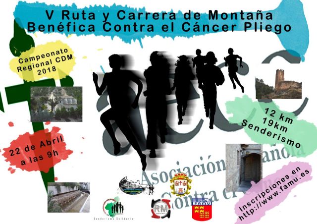 Este domingo 22 de abril se celebra la 5ª edición de la Ruta y Carrera de Montaña Benéfica contra el Cáncer de Pliego. Una prueba en la que se espera una gran movilización tanto de la ciudadanía pleguera como de deportistas llegados de todos los puntos de la Región de Murcia y que contribuirán a aportar su granito de arena, ya que todos los beneficios de la prueba irán destinados a colaborar con la Asociación Española Contra el Cáncer (AECC) como ya viene siendo habitual.